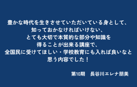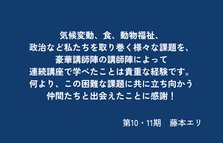 気候変動、食、動物福祉、政治など私たちを取り巻く様々な課題を、豪華講師陣の講師陣によって連続講座で学べたことは貴重な経験です。何より、この困難な課題に共に立ち向かう仲間たちと出会えたことに感謝!