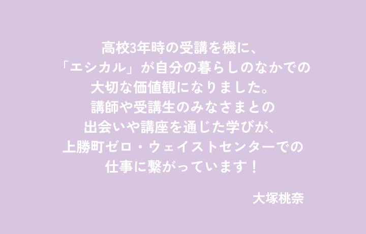 高校3年時の受講を機に、「エシカル」が自分の暮らしのなかでの大切な価値観になりました。講師や受講生のみなさまとの出会いや講座を通じた学びが、上勝町ゼロ・ウェイストセンターでの仕事に繋がっています!