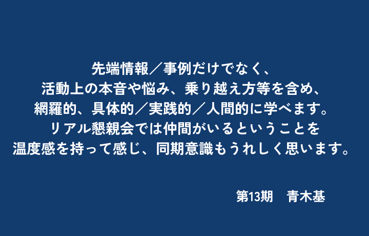 これまでの受講生の声 第13期 青木基 2025.10.25 2025.11.15 Post Share Hatena Line RSS feedly Pin it note 先端情報/事例だけでなく、活動上の本音や悩み、乗り越え方等を含め、網羅的、具体的/実践的/人間的に学べます。リアル懇親会では仲間がいるということを温度感を持って感じ、同期意識もうれしく思います。 記事のタイトルとURLをコピーする 第13期 H.T. 前の記事 第2期 いしだじゅり 次の記事