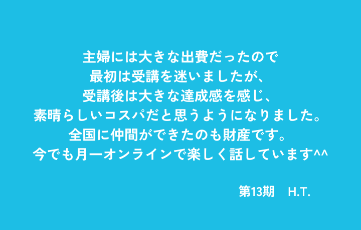これまでの受講生の声 第13期 H.T. 2025.10.25 2025.11.15 Post Share Hatena Line RSS feedly Pin it note 主婦には大きな出費だったので最初は受講を迷いましたが、受講後は大きな達成感を感じ、素晴らしいコスパだと思うようになりました。全国に仲間ができたのも財産です。今でも月一オンラインで楽しく話しています^^ 記事のタイトルとURLをコピーする 第11期 池見浩 前の記事 第13期 青木基 次の記事
