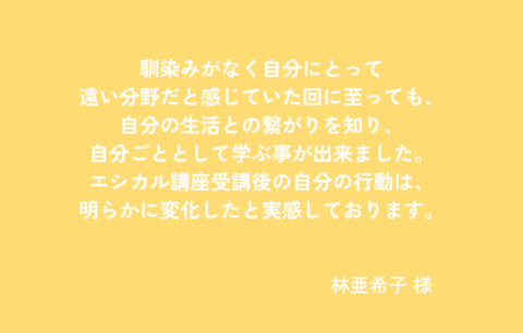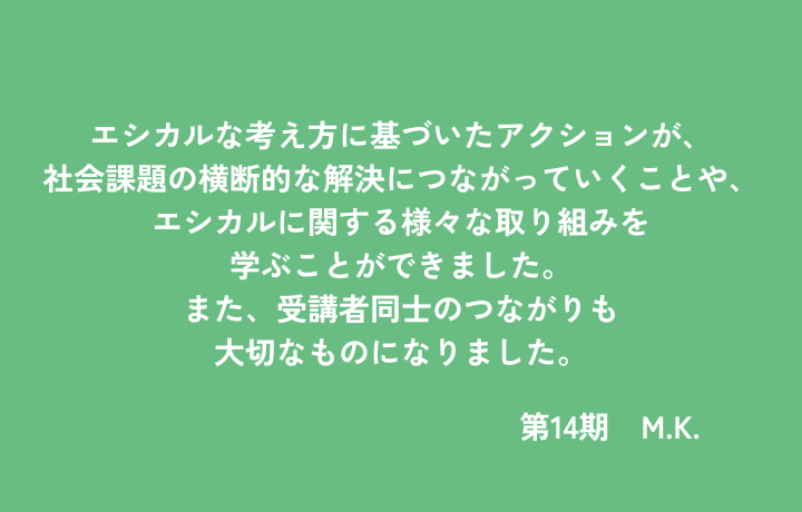 これまでの受講生の声 第14期 M.K. 2025.10.25 2025.11.15 Post Share Hatena Line RSS feedly Pin it note エシカルな考え方に基づいたアクションが、社会課題の横断的な解決につながっていくことや、エシカルに関する様々な取り組みを学ぶことができました。また、受講者同士のつながりも大切なものになりました。 記事のタイトルとURLをコピーする 第2期 いしだじゅり 前の記事 第14期 前田紘子 次の記事