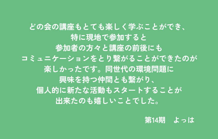 どの会の講座もとても楽しく学ぶことができ、特に現地で参加すると参加者の方々と講座の前後にもコミュニケーションをとり繋がることができたのが楽しかったです。同世代の環境問題に興味を持つ仲間とも繋がり、個人的に新たな活動もスタートすることが出来たのも嬉しいことでした。