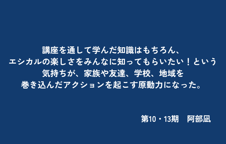 これまでの受講生の声 第10・13期 阿部凪 2025.10.25 2025.11.15 Post Share Hatena Line RSS feedly Pin it note 講座を通して学んだ知識はもちろん、エシカルの楽しさをみんなに知ってもらいたい!という気持ちが、家族や友達、学校、地域を巻き込んだアクションを起こす原動力になった。 記事のタイトルとURLをコピーする 第9・10期 Miyu 前の記事 第8期 キツカワユウコ 次の記事
