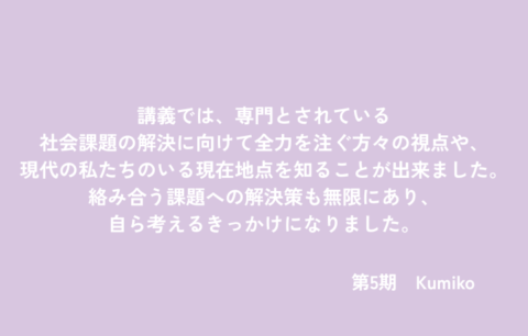 今、どこで、なにが問題となっているか、それに対してどのような活動をしているか、第一線で活躍する講師の皆様から学びました。それがきっかけでオーガニック製品を扱う会社に転職しました。
