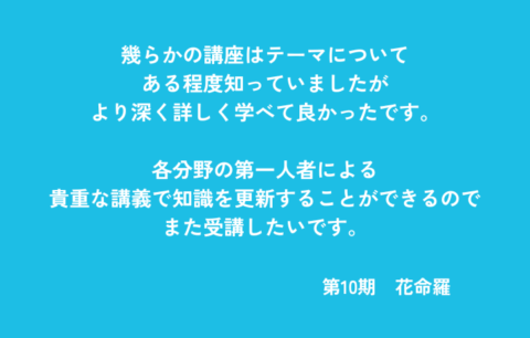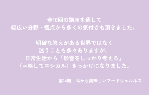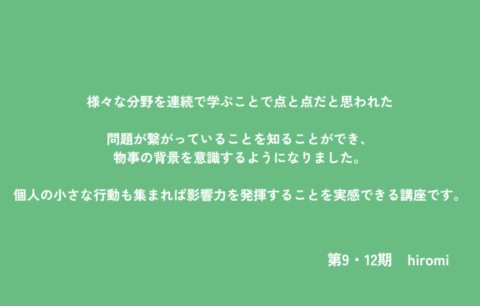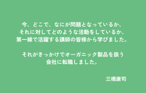モノを買うということの意味や、作り手の気持ちについて知りたいと思って受講したのが、わたしの一歩でした。受講するなかで、金融や政治などあらゆることが繋がっていることが分かり、新しい視点を持てました。