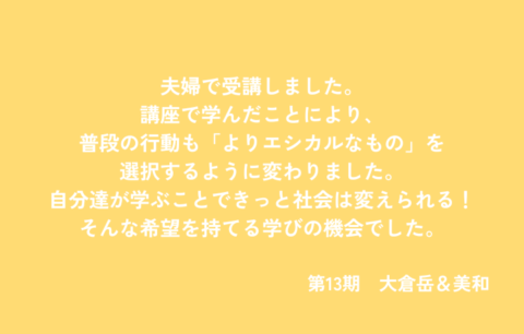 これまでの受講生の声 第9・12期 hiromi 2025.10.25 2025.11.05 Post Share Hatena Line RSS feedly Pin it note 様々な分野を連続で学ぶことで点と点だと思われた問題が繋がっていることを知ることができ、物事の背景を意識するようになりました。個人の小さな行動も集まれば影響力を発揮することを実感できる講座です。 記事のタイトルとURLをコピーする 第1・4・9期 大喜多一範 前の記事