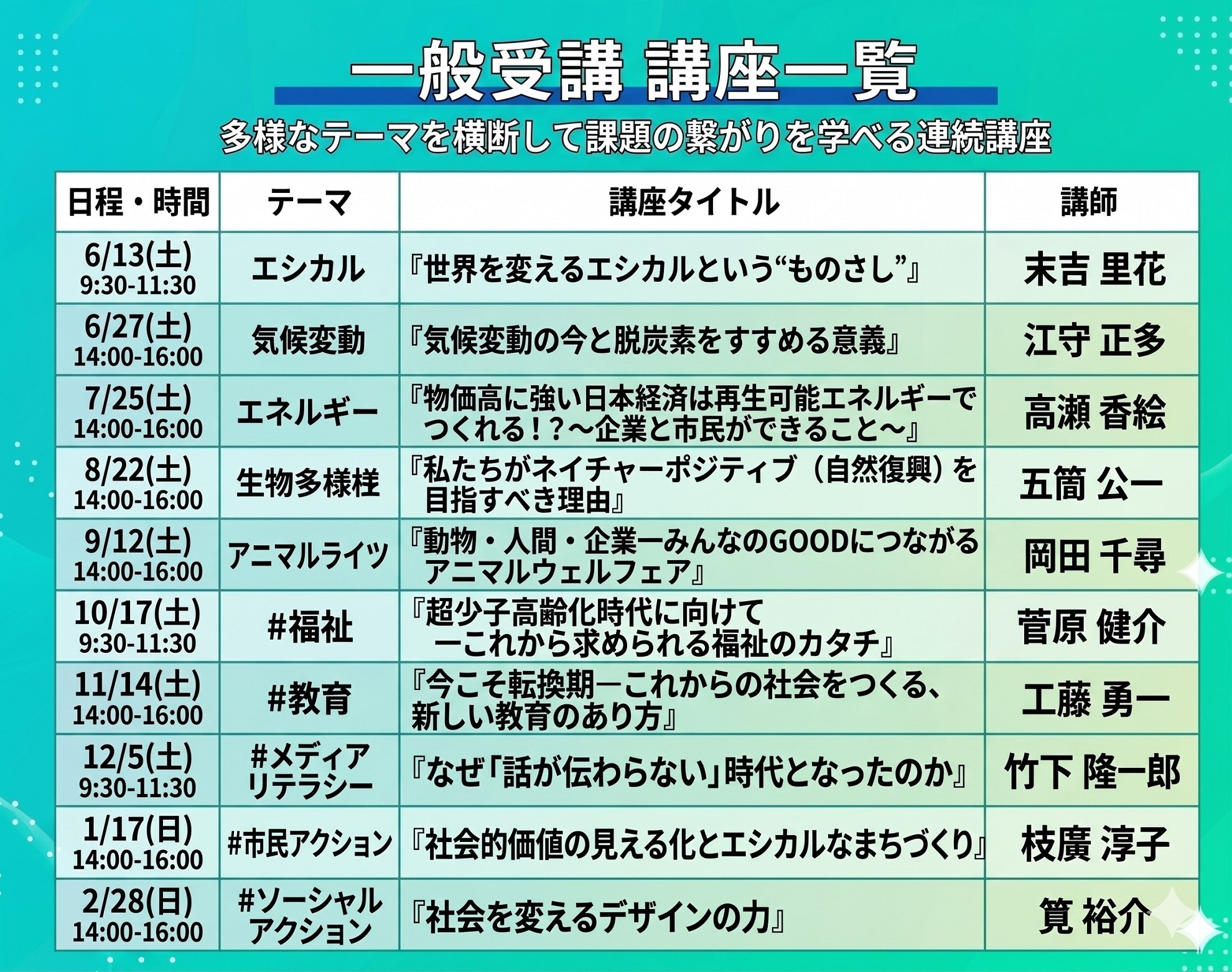 最初は気候変動やアニマルウェルフェアといった個別の「点」だった知識が、回を追うごとに経済、人権、そして「利他」という精神性まで繋がり、すべてが地続きであることを痛感しました。この順序があったからこそ、単なる「物知り」で終わらず、実践者としてのスタートラインに立てたのだと感じました。
